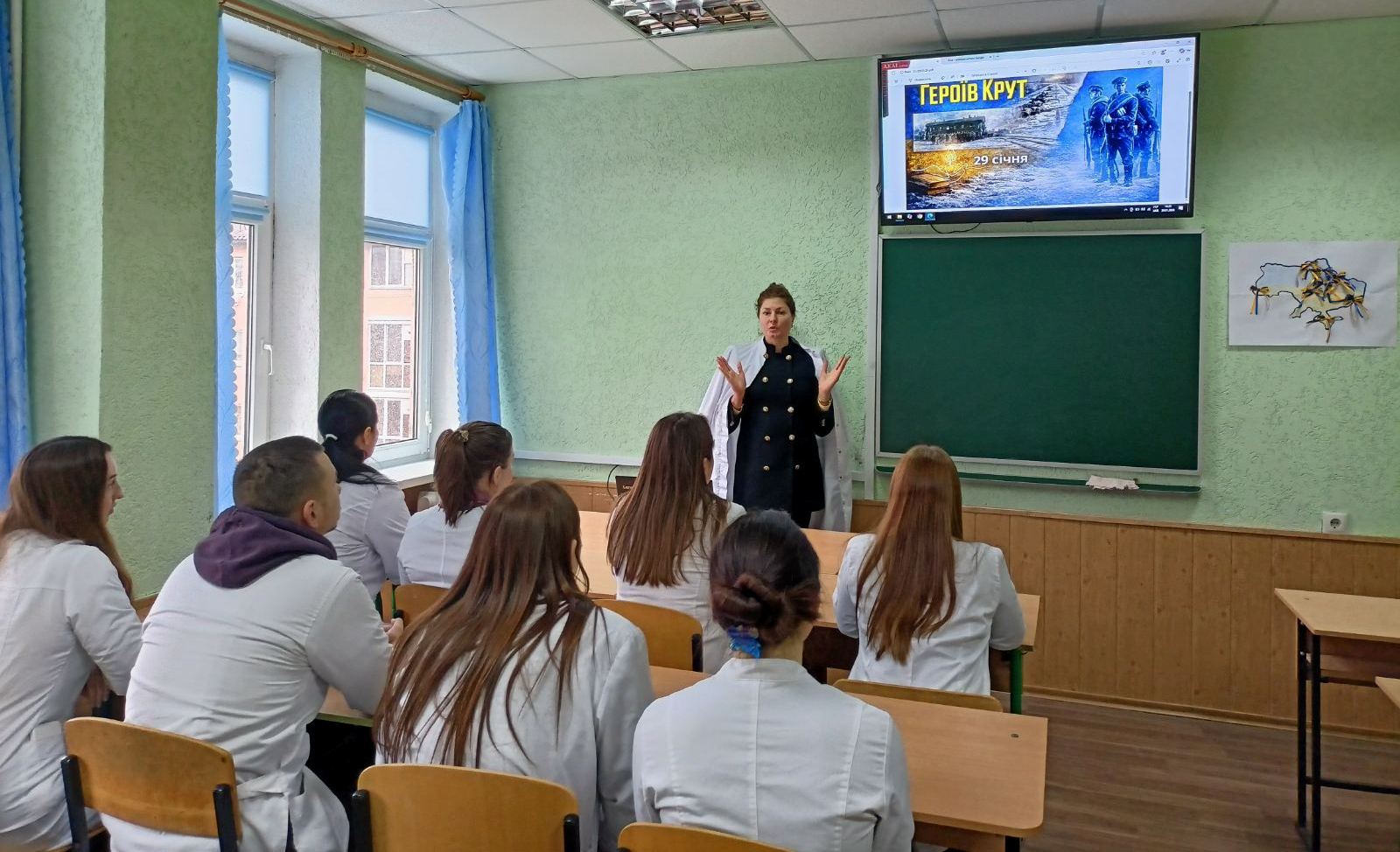 29 січня 2026 року на кафедрі громадського здоров’я, менеджменту та медичної експертизи здобувачі освіти 6 курсу 1-н групи медичного факультету №2 та викладач Подвін Алла до Дня вшанування Героїв Крут шукали відповідь на питання: що спільного між студентом-медиком 2026 року та юнаком, що стояв під Крутами в 1918?